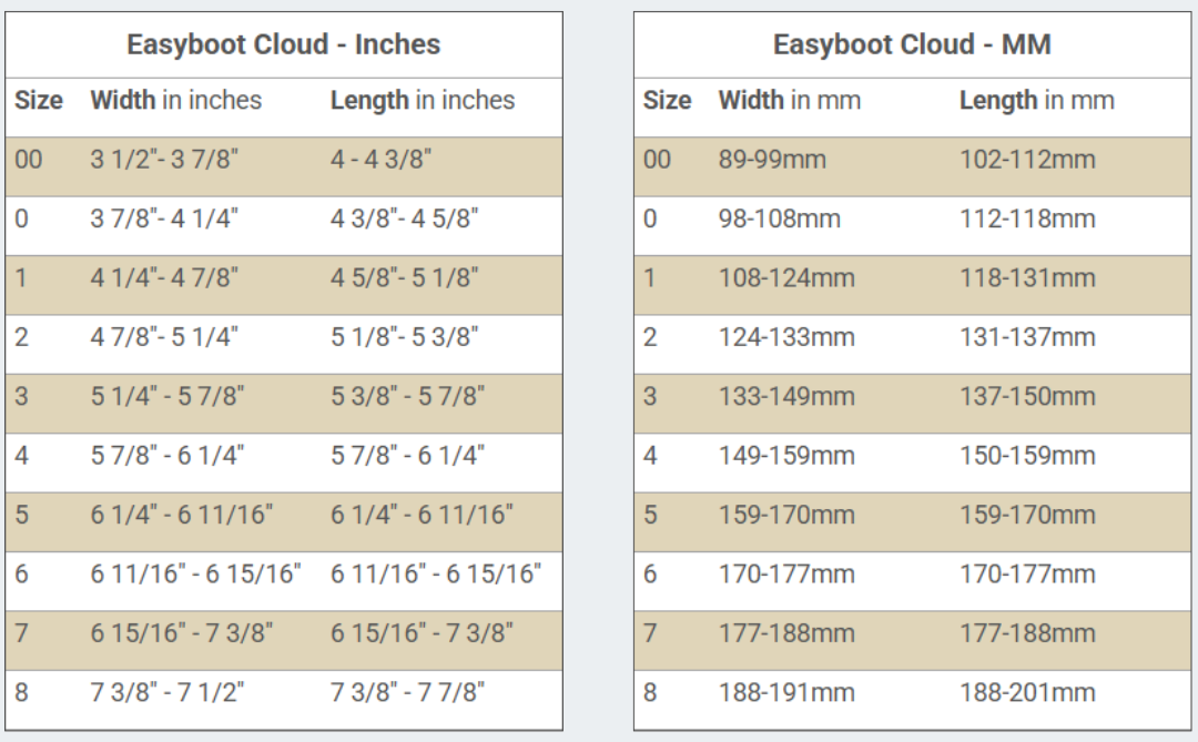 - Please consult the size chart for sizing the Easyboot Cloud for your horse. Easyboot Cloud sizing allows for natural hoof growth between trims. If you intend to use Easyboot Cloud boots over metal shoes*, take your hoof measurements after the horse is freshly shod.